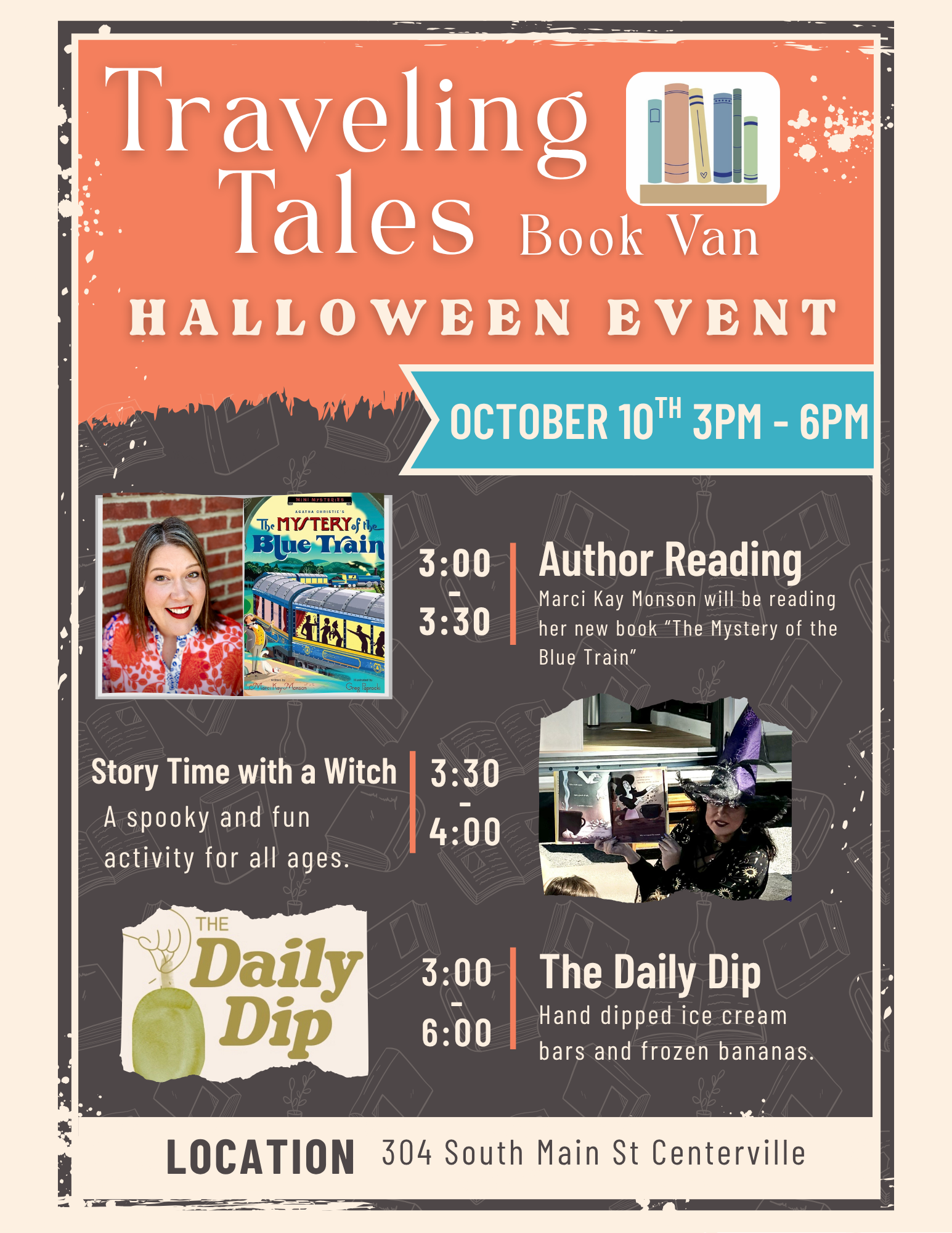 You’re in luck! Come stop in for a spooky story time! We’ll have a sweet and spooky witch, a newly released children’s mystery book read by a local author, your favorite book store on wheels (Traveling Tales), and us, your bestie The Daily Dip!